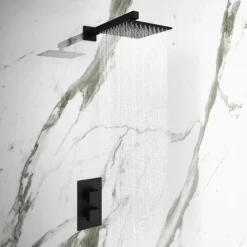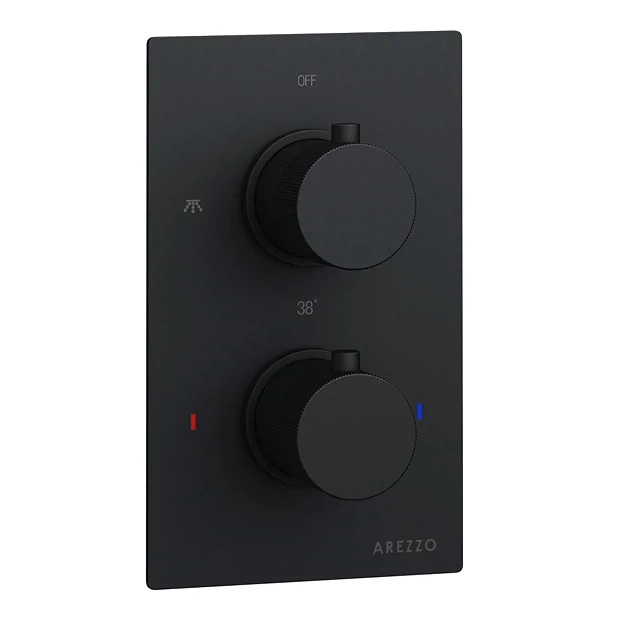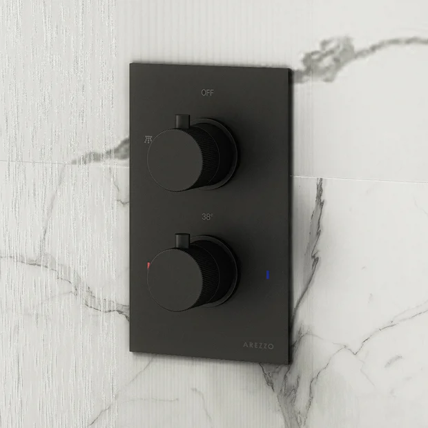 The Arezzo Concealed Thermostatic Shower Valve features a striking round design with a contemporary matt black finish and an decorative fluted texture around the sides of the flow and temperature controls. This ‘twin’ shower valve is perfect for installing in a concealed arrangement, linked to a fixed shower head.Â