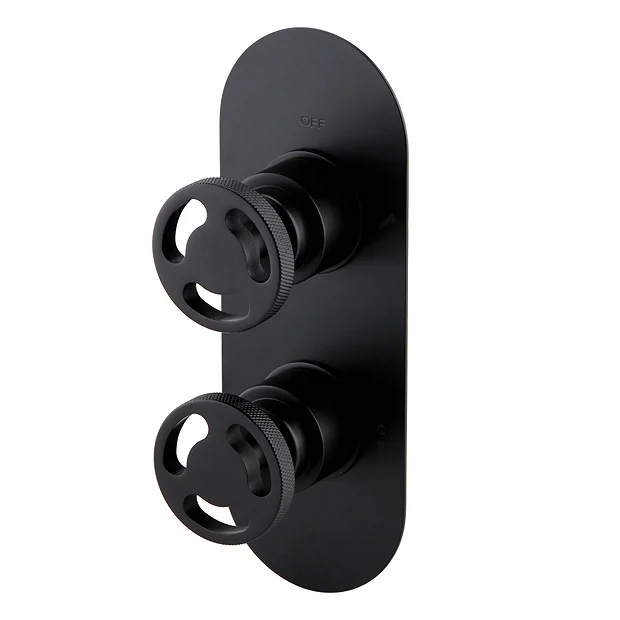 The Arezzo round matt black concealed thermostatic shower valve with built-in diverter features a stripped-down aesthetic with round knurled textured tap heads, perfect for creating an eye catching industrial look in your bathroom.