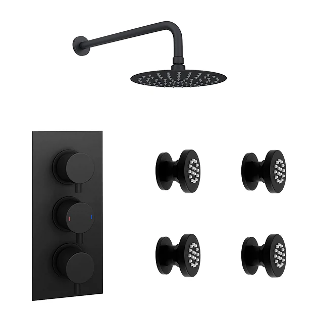 The on-trend Arezzo matt black round range brings substantial elegance to the modern bathroom. Package includes a concealed triple thermostatic shower valve, fixed shower head and 4 round body jets. The shower valve offers thermostatic showering via three easy to operate controls that give you power over temperature and flow. Triple shower valve operates two outlets separately or simultaneously (overhead shower head or body jets). The solid brass construction makes the valve durable and quick to clean thanks to the smooth finish. The ideal solution for multi-option showering.