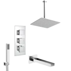- Thermostatic shower, consisting of a square thermostatic bar valve and rigid riser kit with twin square shower heads