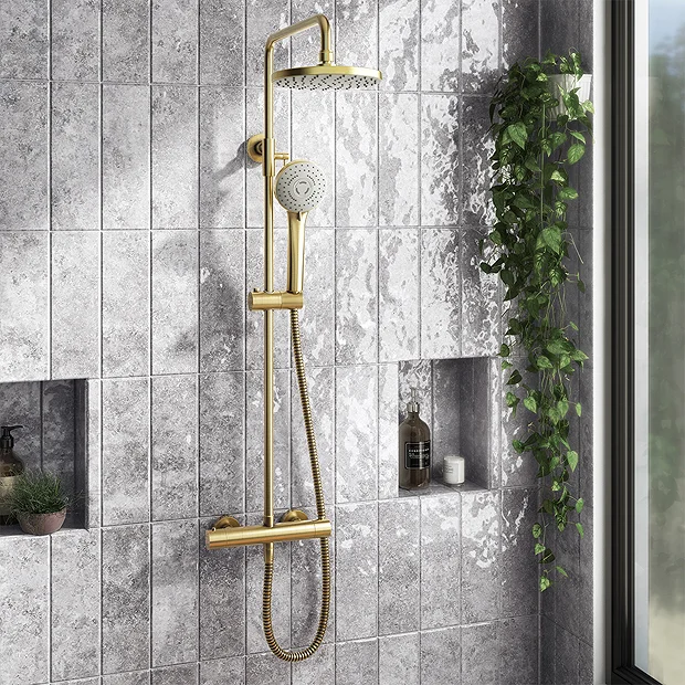 The Arezzo Brushed Brass complete thermostatic shower set offers both the flexibility of a lightweight multi-function spray pattern shower handset and the extravagance of a fixed round overhead drencher. This premium brushed brass thermostatic shower comes complete with the newest ceramic disc technology and is easy to install. Featuring brushed brass shower fixtures in a contemporary round design, it will make a sophisticated centrepiece in your wet room or bathroom. Both shower heads have nozzles than can be rubbed clean to make limescale removal quick and easy.
