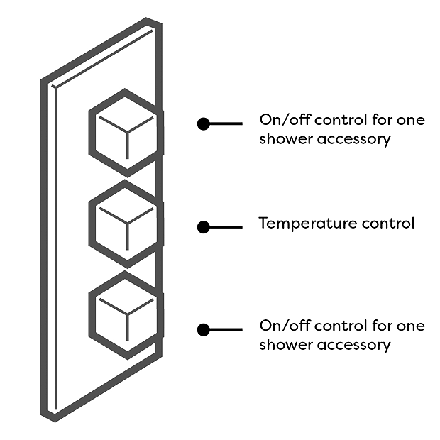 Offers thermostatic showering via three easy-to-operate controls. Separate controls for temperature and flow. Operates two outlets separately or simultaneously e.g. Fixed head / Slide rail kit, Fixed head / Body jets or Slide rail kit / Body jets.