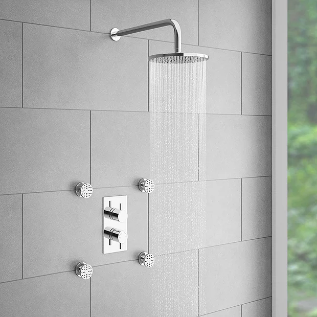 The stylish Cruze shower package, includes a concealed thermostatic shower valve with diverter, round fixed shower head & 4 body jets. This shower pack will compliment any modern bathroom suite, offers thermostatic showering via two easy-to-operate controls for temperature and flow. This shower valve has the added safety benefit of a built in anti scald device should the cold water supply fail. Diverts between two shower accessories: fixed head/body jets.