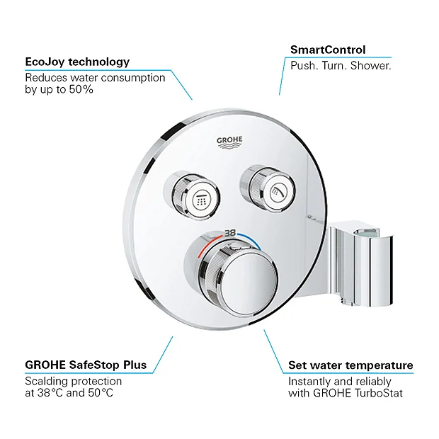 For perfect comfort and safety, the integrated GROHE TurboStat technology prevents unpleasant temperature fluctuations while the SafeStop button protects your sensitive skin from scalding, and thanks to the GROHE CoolTouch system, the shower valve body will never be too hot to touch.Â