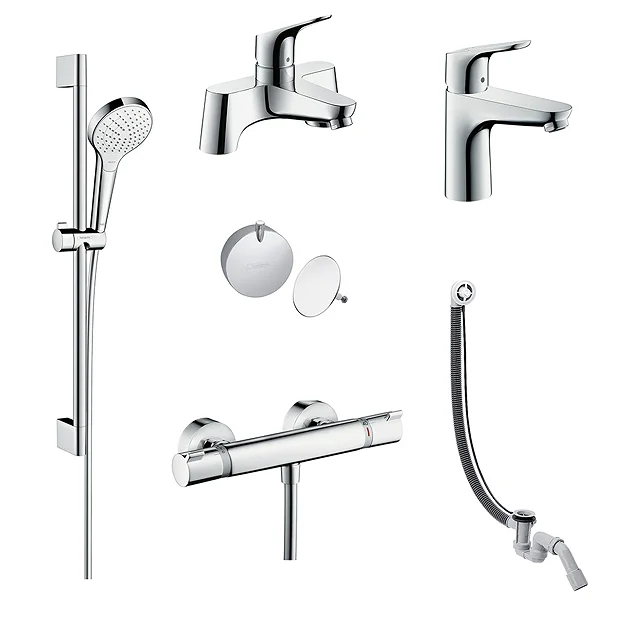 This hansgrohe over bath taps and shower package offers an economical way of adding designer elegance to your bathroom at an attractive price. This complete bundle comprises of a mono basin tap with waste, single lever bath filler, thermostatic bar valve with shower slider rail kit and pop up bath waste.