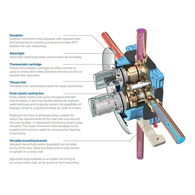 The Connect Easybox Slim Built-in Shower Mixer with Square Faceplate boasts an ultra slim profile allowing it to fit into shallow cavities 43mm deep. It also features double sealing throughout for superior water tightness and a built-in safety stop feature that ensures safe showering. Manufactured from solid brass for durability and finished in chrome.