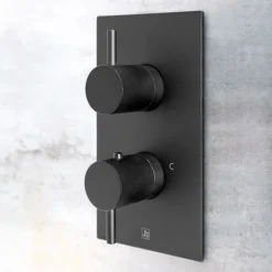 The JTP Vos Brushed Brass Concealed Thermostatic Shower Valve combines modern styling with functionality. This valve controls three outlets separately or simultaneously and diverts to a third option: fixed head and slide rail kit, fixed head and body jets or slide rail kit and body jets with option to divert to free flow bath filler. With separate controls for flow and temperature that makes it easy to use while the thermostatic valve ensures safe showering and constant temperature.