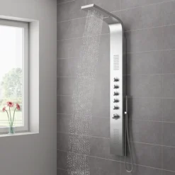 If you’re looking for luxe and contemporary shower fittings, consider the Milan Square Thermostatic Bar Shower Valve. This valve has two outlets, so can be combined with a showerhead and handset. There are dual controls for temperature and flow and the unit is thermostatic so it won’t freeze you even if someone’s running a tap elsewhere. For added comfort and safety, the anti scald feature will keep the spray at a maximum of 38°C unless adjusted with the push button. Decorative covers on the pipework will conceal tile edges for a neat appearance.