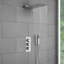 Offers thermostatic showering via easy-to-operate controls, the square handle controls temperature whilst the push-buttons operate three outlets.