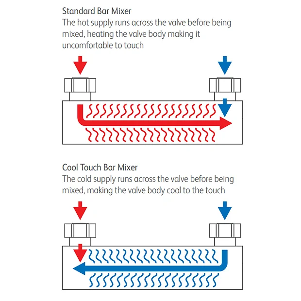 The stylish Monza ‘Cool Touch’ thermostatic bar valve, designed to provide safe showering for all the family. This stunning minimalist chrome bar valve has separate controls for temperature and flow. Cold water is circulated around the bar valve itself so that it is cool to the touch.
