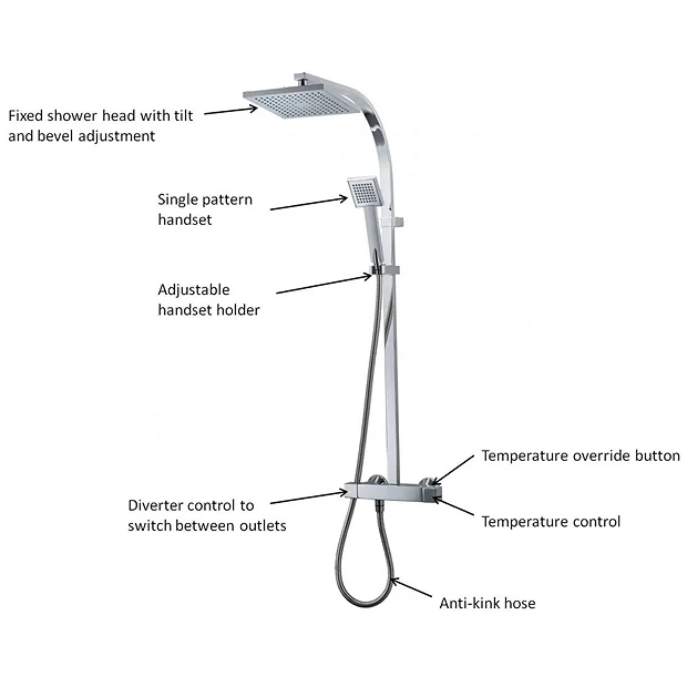The cool square and angled design of the Tees range and chrome plated finish makes a style statement in any bathroom. This thermostatic bar shower mixer features individual controls for temperature and flow and combines the luxury of a large 200mm square shaped fixed head and a matching height adjustable handset. Its thermostatic feature gives a constant regulated temperature giving you more precise control and safer showering, whilst the automatic shutdown function is an added safety feature should any of the water supplies fail.