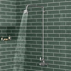 Features easy to operate controls, the top control operates one shower accessory the centre control adjusts the temperature and the bottom control operates the other shower accessory.